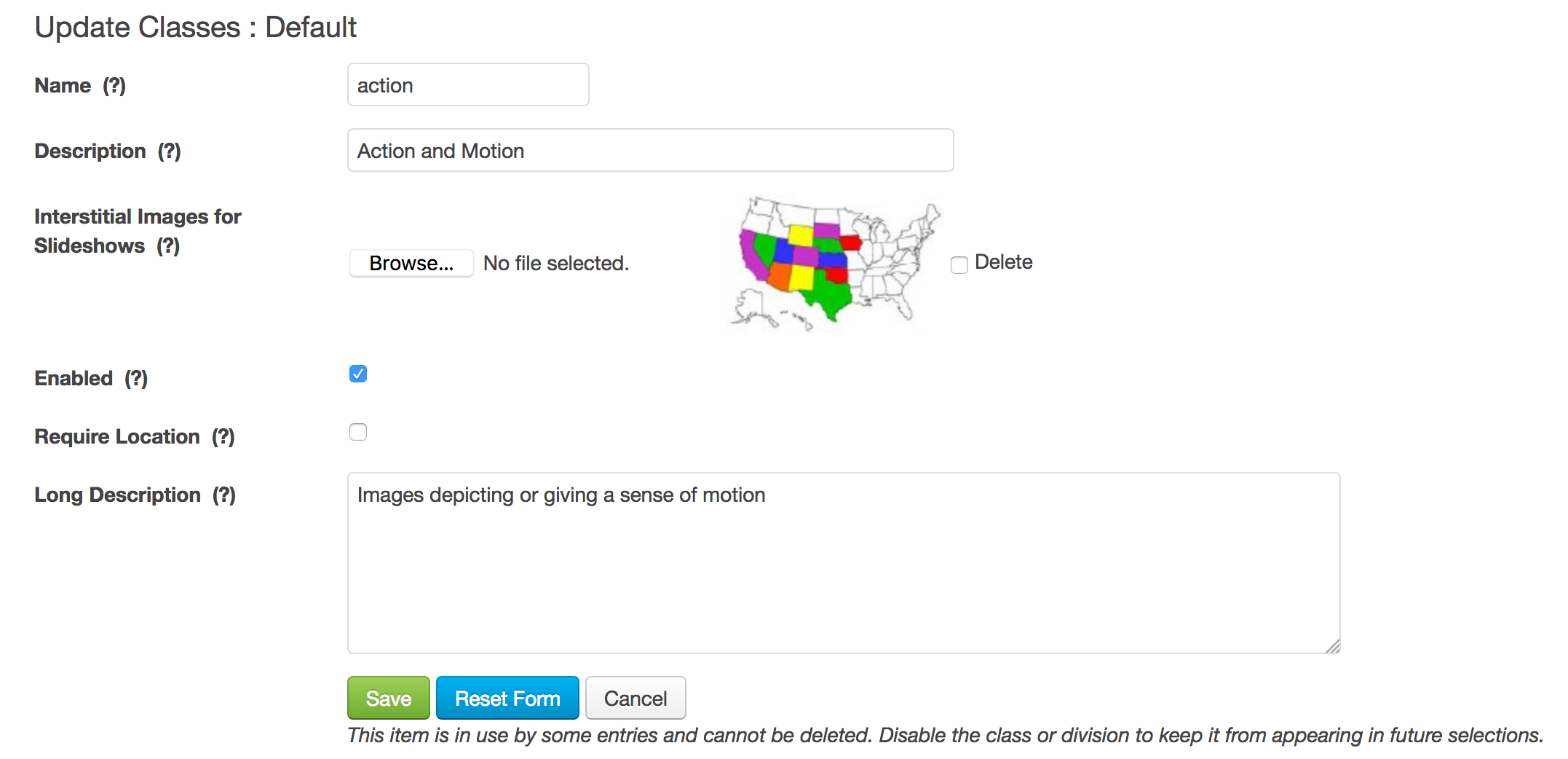 | Interstitial Image | You may upload an image to be used as a class separator when creating slideshows. See Reports. |