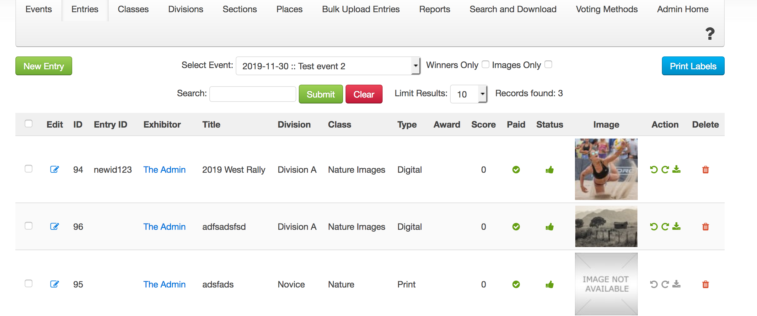 | Delete | Click the trash can icon to delete the entry. If the entry is pre-registered you'll be given the option to delete the entry record completely, or to only clear the image and leave the entry in place. |