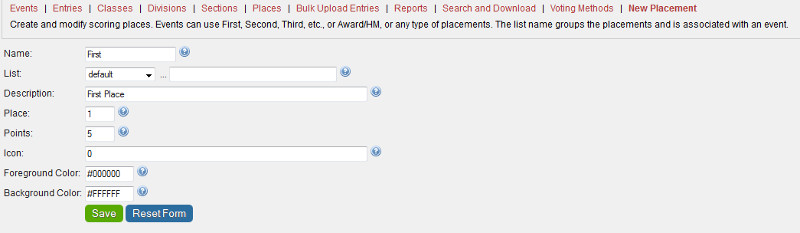 | Points | If points are accumulated for entrant standings, enter the point value for this placement. |