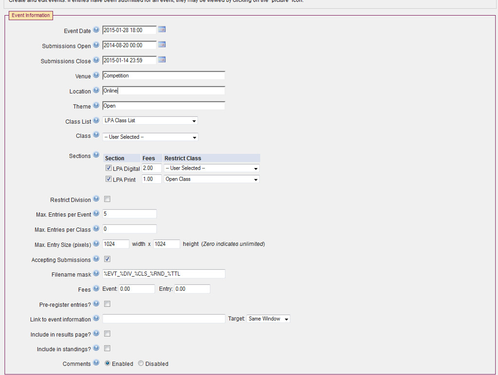 | Max entries per event | Enter the maximum number of entries that can be uploaded by an entrant to this event. Enter “0” for unlimited. |
