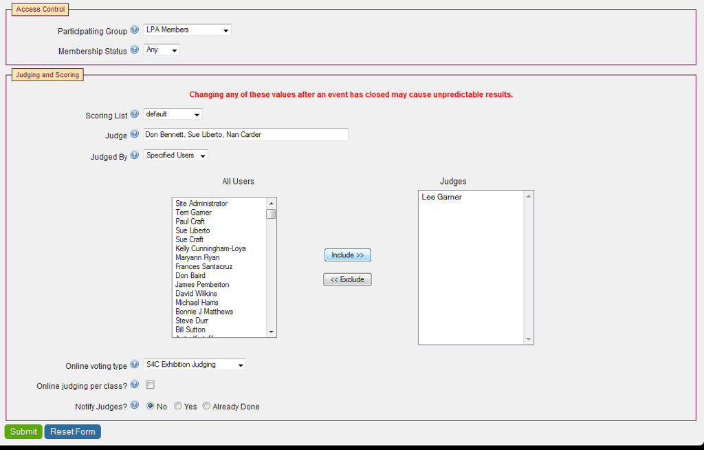 Most of the administration is creating and updating Events. Before creating an event you should be sure that the Divisions, Classes, Voting Methods, Placements and Sections are set up. Once done, those elements typically require little administration.